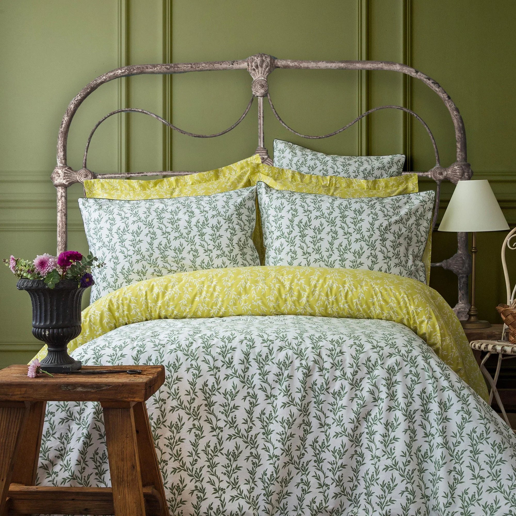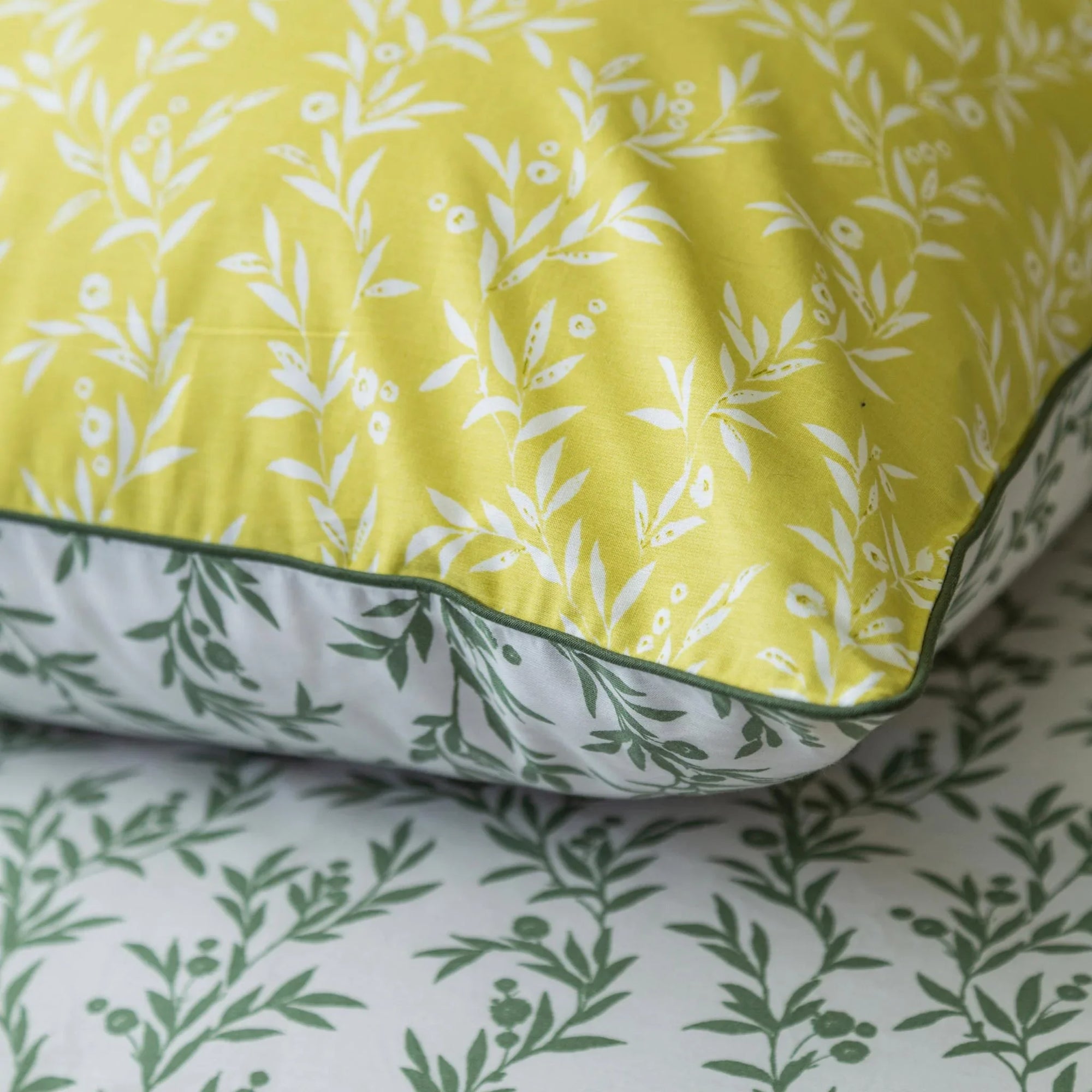 Parure de lit en percale pure, motif floral vert olive et jaune (FR)